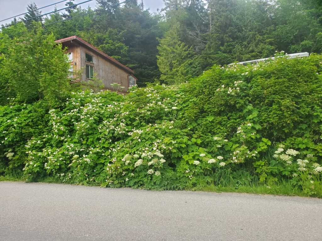 Here are some thimbleberry blossoms and pushke (aka cow parsnip, aka Indian celery) flowers: