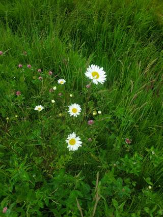 Here are some bachelors’ buttons, buttercups, daisies (which smell like dirty socks but look nice) and purple clover to round things out. Also some wild mint.