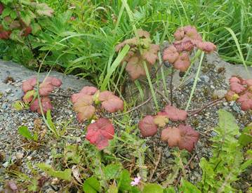 These fall-looking leaves were clustered around the roots of the old alder. Thimbleberries? Cranberries? You be the judge: