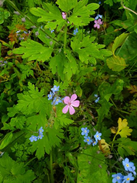 Here are some forget-me-nots (the Alaska state flower) next to some big green leaves and a pretty pink thing that I cannot identify. Forget-me-nots are very tiny and very beautiful.