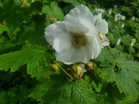 Thimbleberry blossom in the singular. They are so called because when you pick them you get a thimble-shaped shell of drupelets. Drupelet is my new favorite word.